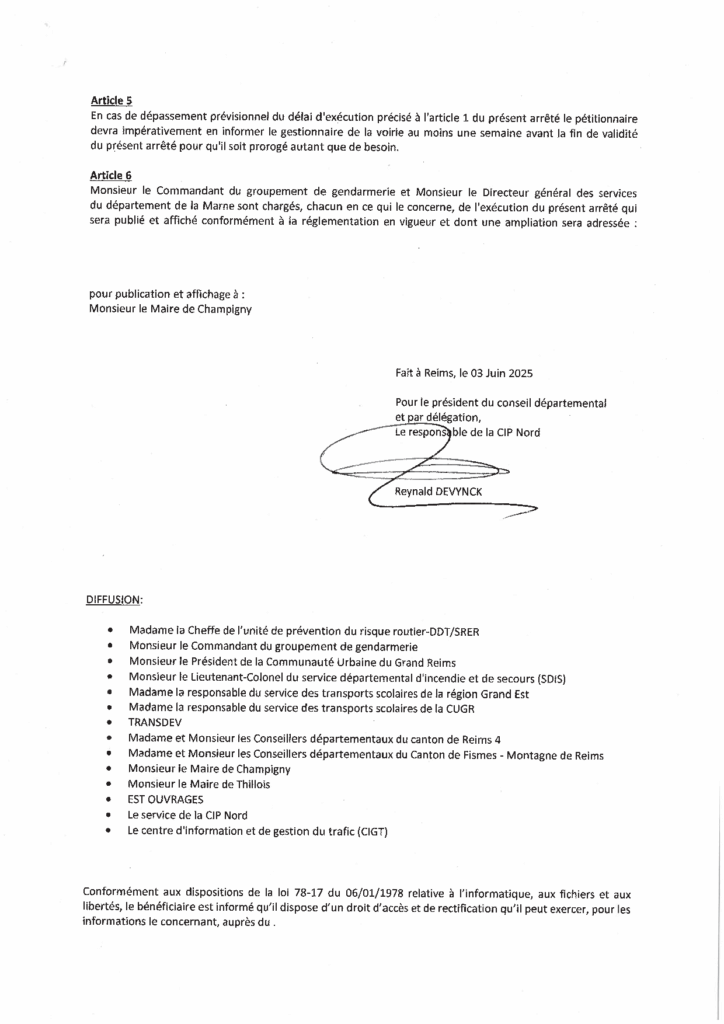 Afin d’assurer la sécurité des usagers lors des travaux de nettoyage des tags et de réparation du pont A26, il est nécessaire de réglementer la circulation sur la RD 75 à la sortie de la commune (PR 5+772) à compter du 07/05/2025 pour une durée de 15 jours. jusqu’au 30/06/2025.