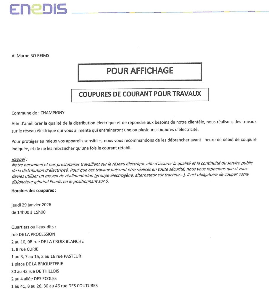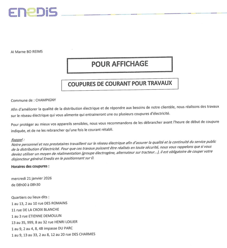 ENEDIS vous informe que des travaux entrainant des coupures d’électricité sont prévus les 21 et 29 janvier 2026