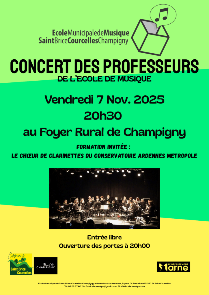 Comme chaque année, l’école de musique de Saint-Brice-Courcelles Champigny a le plaisir de vous convier à son concert des professeurs, le vendredi 7 novembre à 20h30. La Salle des fêtes de Saint-Brice-Courcelles étant en travaux, cette édition 2025 sera l’occasion de donner notre concert au Foyer Rural de Champigny (Rue des Sablières, 51370 Champigny).