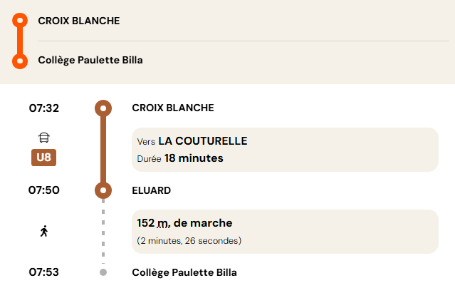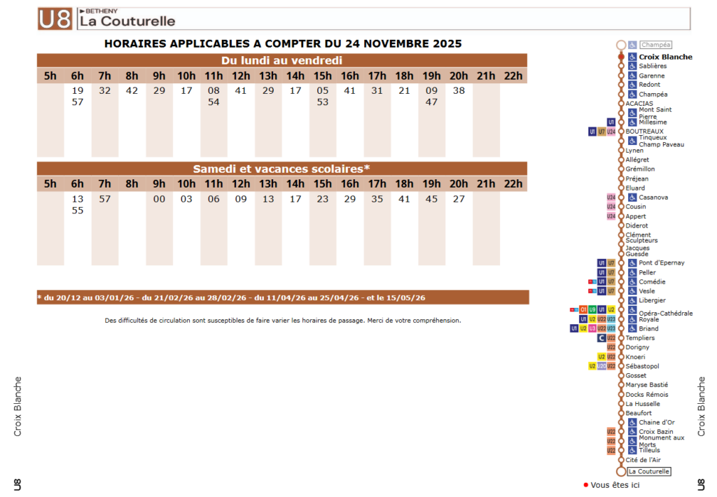 À titre informatif, veuillez trouver ci-après la fiche horaire de la ligne U8 :