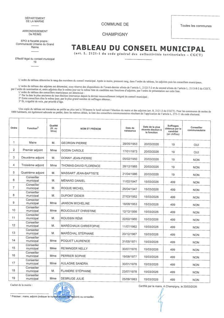 Tableau du Conseil Municipal 2026